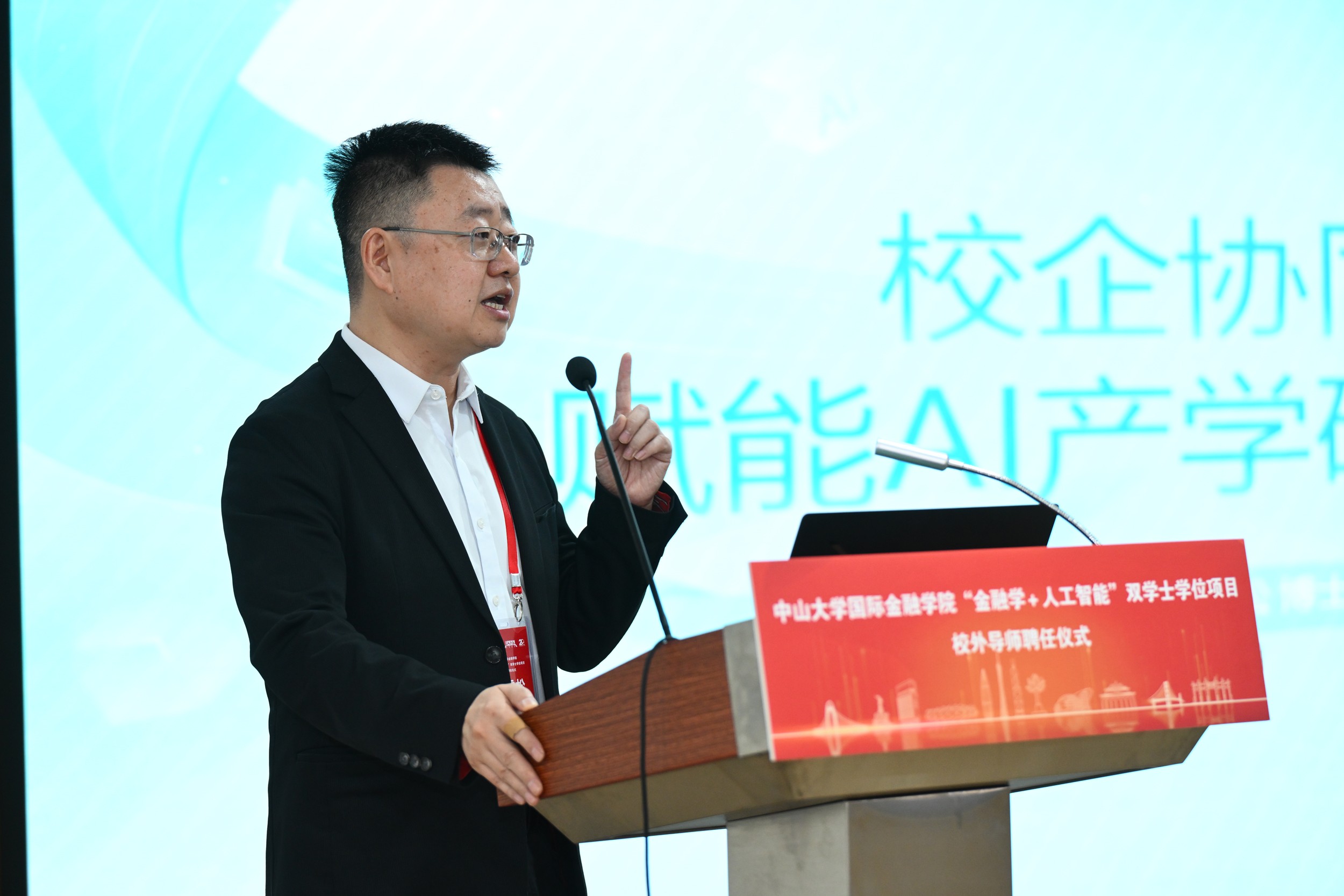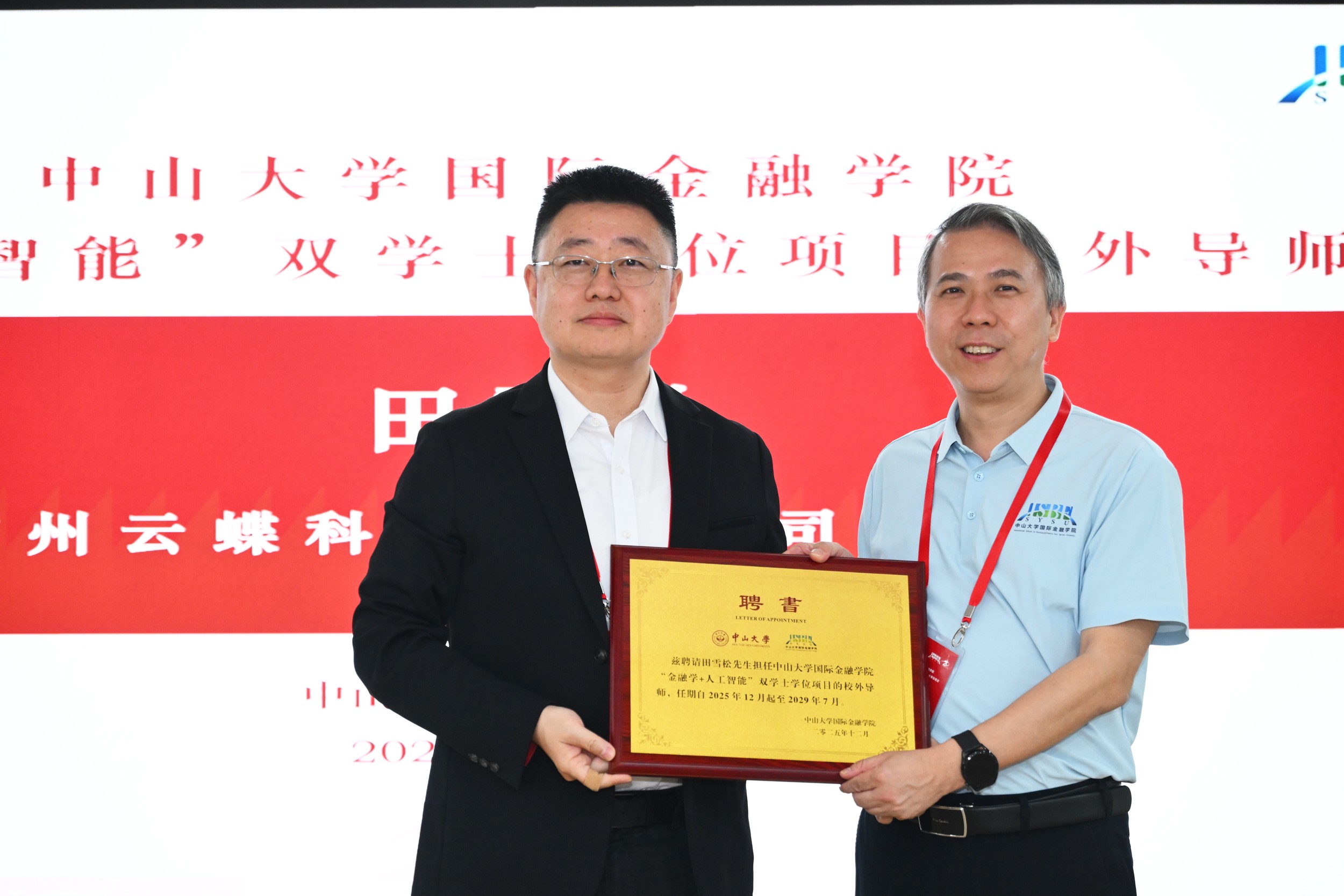 近日,中山大学国际金融学院“金融学+人工智能”双学士学位项目首届校外导师聘任仪式在广州校区南校园隆重举行。中山大学国际金融学院院长黄新飞教授为活动致辞,云蝶科技总裁田雪松博士受邀出席并受聘为该项目的首届校外导师,校方领导、师生代表共同见证这一深化产教融合的重要时刻。