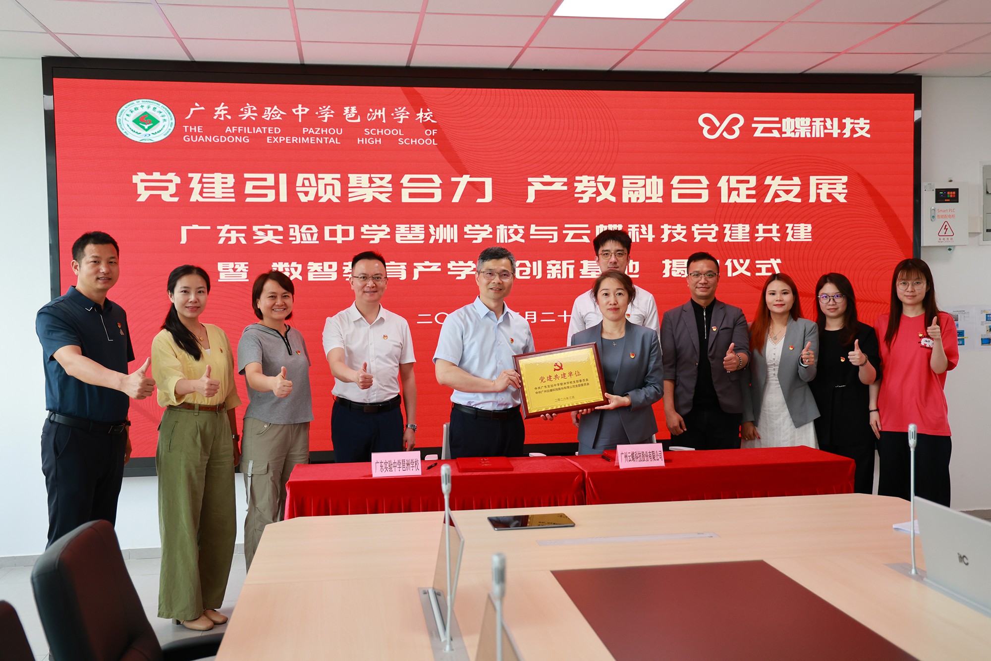 在全体与会人员的见证下,双方签署了党建共建协议及产学研合作协议,并先后为“党建共建单位”和“数智教育产学研创新基地”揭牌。这标志着云蝶科技与省实琶洲学校在党组织建设、党员教育管理、人才培养、技术研发等方面正式建立全方位合作关系,共同探索党建共建、产教融合新范式。